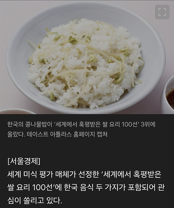 '세계 최악 쌀 요리 100선’ 3위 한국 음식 작성자 정보 하프라인 작성 작성일 2025.12.26 17:06 컨텐츠 정보 238,207 조회 목록 본문 콩나물밥이번 목록에서 한국 음식 가운데 가장 낮은 평가를 받은 것은 평점 5점 만점에 2.4점을 기록한 ‘콩나물밥’으로, 전체 3위에 올랐다. 테이스트 아틀라스는 콩나물밥을 “한국에서 유래한 전통적인 쌀 요리"라며 "콩나물을 밥과 함께 지어 간장, 마늘, 참기름 등을 곁들여 먹는 음식”이라고 소개했다.========================몸에도 좋고 맛있는데 좀 먹지그러냐.. 관련자료 댓글 0 등록된 댓글이 없습니다. 로그인한 회원만 댓글 등록이 가능합니다. 목록