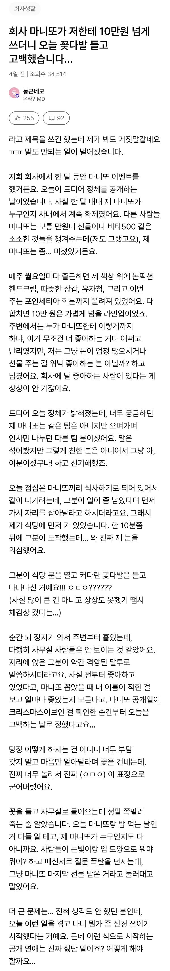 회사 마니또가 저한테 10만원 넘게 쓰더니 오늘 꽃다발 들고 고백했습니다... 작성자 정보 하프라인 작성 작성일 2026.01.01 18:27 컨텐츠 정보 222,209 조회 목록 본문 마니또 바이럴이네 관련자료 댓글 0 등록된 댓글이 없습니다. 로그인한 회원만 댓글 등록이 가능합니다. 목록