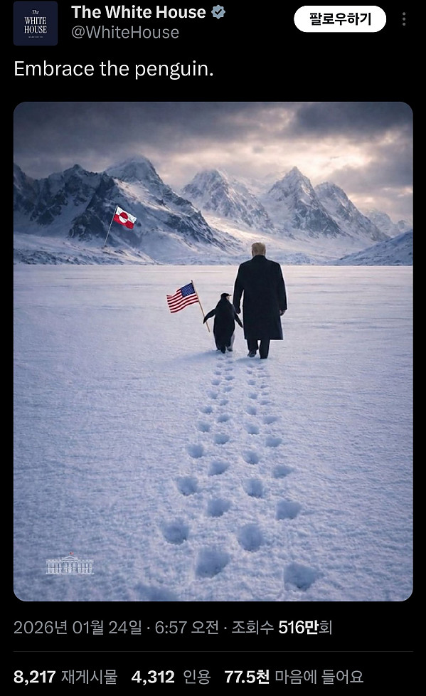 펭귄을 포용하라는 백악관 트위터 작성자 정보 하프라인 작성 작성일 2026.01.25 19:29 컨텐츠 정보 225,431 조회 목록 본문 https://twitter.com/WhiteHouse/status/2014819683757678654?s=20북반구에는 펭귄이 안사는데? 관련자료 댓글 0 등록된 댓글이 없습니다. 로그인한 회원만 댓글 등록이 가능합니다. 목록