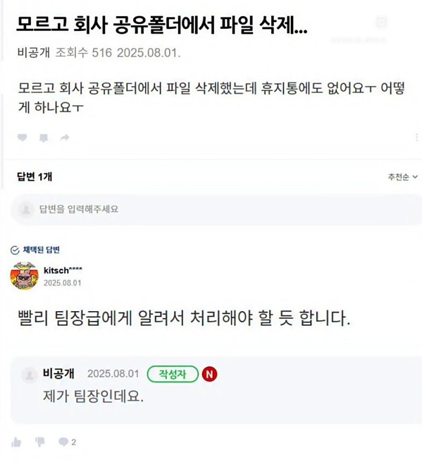 실수로 회사 공유폴더에서 파일을 삭제 했어요 작성자 정보 하프라인 작성 작성일 2025.08.11 13:18 컨텐츠 정보 80,751 조회 목록 본문 제가 팀장인데요. 관련자료 댓글 0 등록된 댓글이 없습니다. 로그인한 회원만 댓글 등록이 가능합니다. 목록