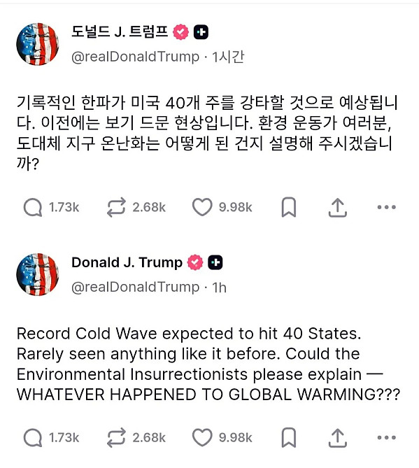 트럼프 "진짜 추운데 이게 어떻게 지구 온난화란거야?" 작성자 정보 하프라인 작성 작성일 2026.01.25 19:27 컨텐츠 정보 228,659 조회 목록 본문 https://truthsocial.com/@realDonaldTrump/115944376084632033알고서도 저러는건가 아니면 진짜 몰라서 저러는건가.. 관련자료 댓글 0 등록된 댓글이 없습니다. 로그인한 회원만 댓글 등록이 가능합니다. 목록