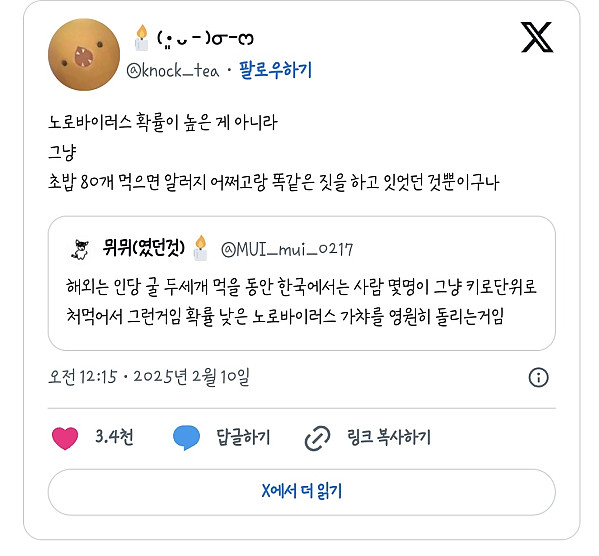 한국인들이 노로 바이러스 잘 걸리는 이유 작성자 정보 하프라인 작성 작성일 2026.01.06 18:09 컨텐츠 정보 222,037 조회 목록 본문 한국 굴은 다른 나라 굴보다 바이러스가 더 적지만,한국인들은 다른 나라 사람들보다 굴을 훨씬 훨씬 더 많이 먹어서,그 적은 확률에도 불구하고 노로바이러스 감염률이 높다.마치 낮은 확률의 가챠 아이템을 천장을 쳐서 획득하는 것처럼... 관련자료 댓글 0 등록된 댓글이 없습니다. 로그인한 회원만 댓글 등록이 가능합니다. 목록