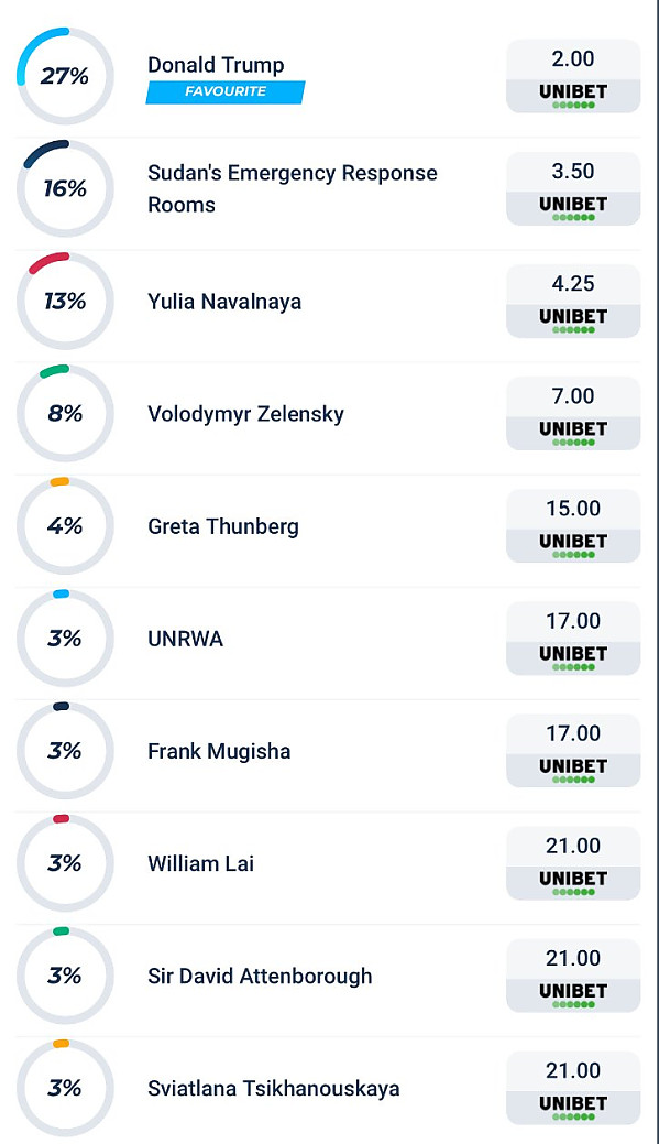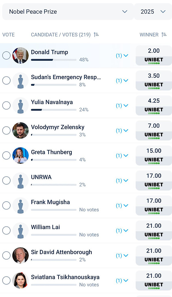 노벨평화상 배당률 근황 작성자 정보 토렉스 작성 작성일 2025.10.07 12:03 컨텐츠 정보 330,096 조회 목록 본문 실제로 트럼프가 노벨평화상을 받을 일은 없겠죠? 노벨평화상 배당률 근황 관련자료 댓글 0 등록된 댓글이 없습니다. 로그인한 회원만 댓글 등록이 가능합니다. 목록