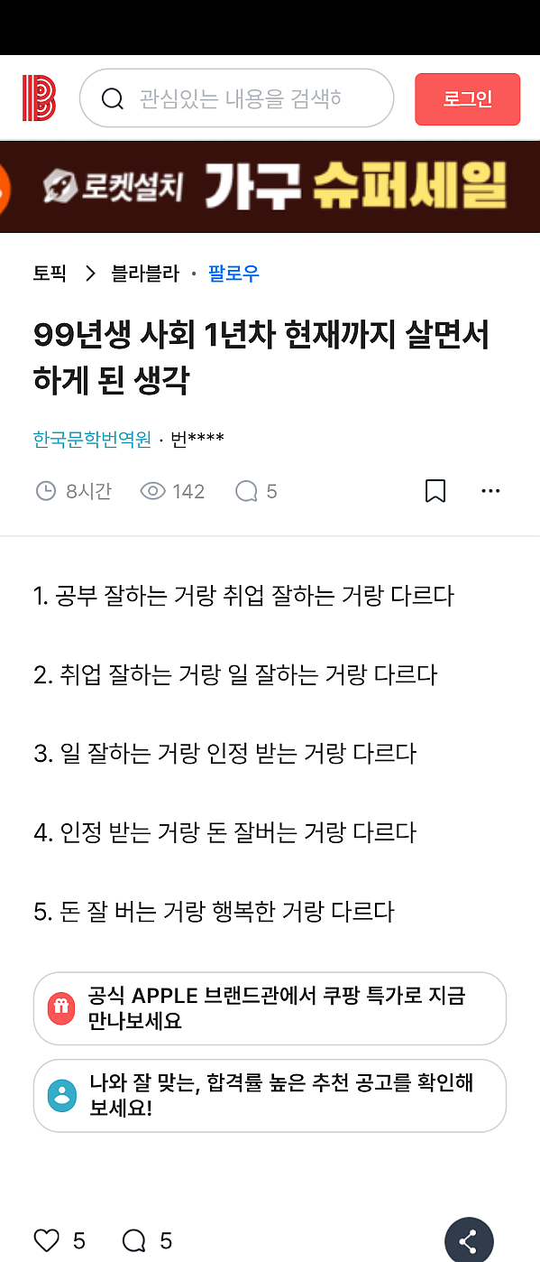 99년생 사회 1년차 현재까지 살면서 하게 된 생각 작성자 정보 토렉스 작성 작성일 2025.10.08 11:44 컨텐츠 정보 372,643 조회 목록 본문 관련자료 댓글 0 등록된 댓글이 없습니다. 로그인한 회원만 댓글 등록이 가능합니다. 목록