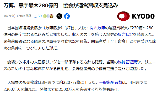 일본 국제박람회협회(엑스포협회)는 7일, 오사카·간사이 엑스포의 운영비 수지가 230억~280억 엔의 흑자를 기록할 전망이라고 발표했다. 이는 수입의 대부분을 차지하는 입장권 판매 상황을 반영한 것이다. 폐막 전 마지막 임시 이사회에서 재무 상황을 보고했으며, 관계자들이 '지상명령'으로 여겼던 성공 조건을 하나 충족한 셈이다.