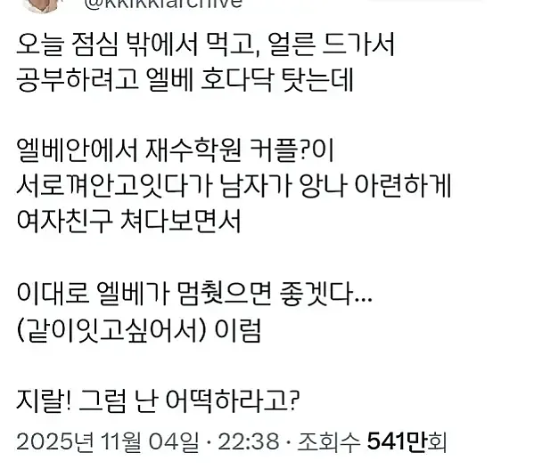 이대로 엘베가 멈췄으면 좋겠다... 작성자 정보 하프라인 작성 작성일 2025.11.07 16:48 컨텐츠 정보 168,901 조회 목록 본문 관련자료 댓글 0 등록된 댓글이 없습니다. 로그인한 회원만 댓글 등록이 가능합니다. 목록