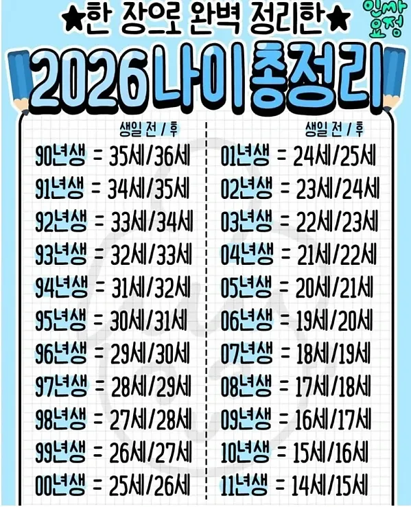 한 장으로 쉽게 알아보는 2026 나이 총정리 작성자 정보 하프라인 작성 작성일 2025.11.13 11:21 컨텐츠 정보 220,130 조회 목록 본문 정말 많은 도움이 되었습니다 관련자료 댓글 0 등록된 댓글이 없습니다. 로그인한 회원만 댓글 등록이 가능합니다. 목록