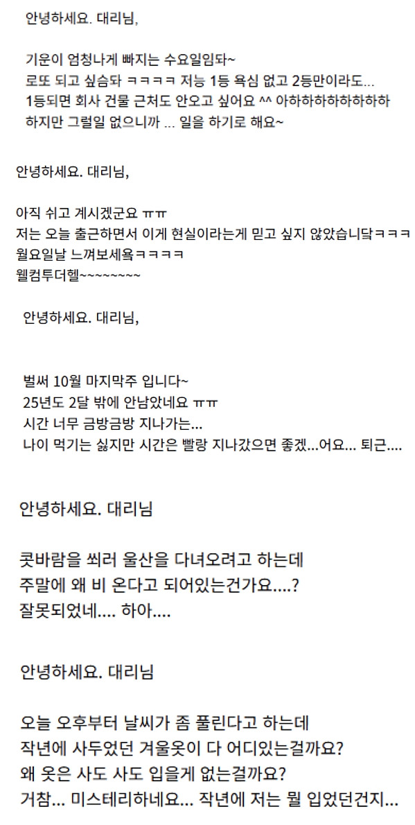 정산 메일에 개인 사족을 붙여서 보내는 거래처 직원 작성자 정보 하프라인 작성 작성일 2025.11.17 15:56 컨텐츠 정보 183,611 조회 목록 본문 인간미가 느껴지네요 관련자료 댓글 0 등록된 댓글이 없습니다. 로그인한 회원만 댓글 등록이 가능합니다. 목록