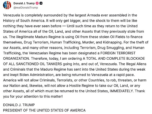 트럼프, 베네수엘라 마두로 정권을 "테러단체"로 공식 지정