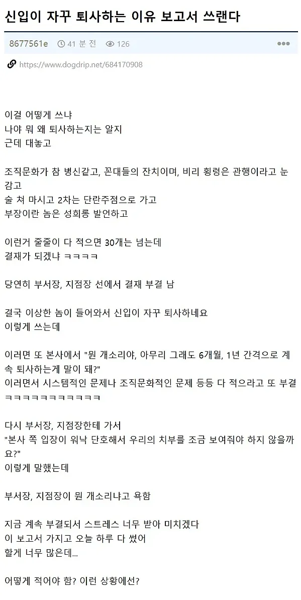 신입이 자꾸 퇴사해서 곤란한 상황의 중간관리자 작성자 정보 하프라인 작성 작성일 2026.02.04 13:54 컨텐츠 정보 48,428 조회 목록 본문 가불기네 진짜 본사쪽은 대충 상황파악하고 있는거같은디... 관련자료 댓글 0 등록된 댓글이 없습니다. 로그인한 회원만 댓글 등록이 가능합니다. 목록