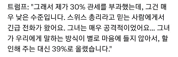 트럼프가 스위스 관세를 39%로 높였던 이유 작성자 정보 하프라인 작성 작성일 2026.02.14 11:40 컨텐츠 정보 11,292 조회 목록 본문 [스위스 총리 말투가 싸가지 없어서]이것이 세계 최강대국의 치밀하고 체계적인 관세협상이다!참고로 스위스는 총리가 없고 저때 대화상대는 스위스 대통령이었음. 관련자료 댓글 0 등록된 댓글이 없습니다. 로그인한 회원만 댓글 등록이 가능합니다. 목록